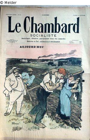 drawing with black chalk on stone (edition of 100 copies / of which 01 - 60 in black and 61 - 100 coloured); monogram on the plate at the bottom left: P.P. (Petit Pierre = Small Stone = Steinlen); coloured version of this lithograph was also used as title page of the magazine "Le Chambard Sozialiste" No.16 from 31.03.1894