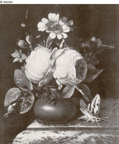 Auf der Ecke eines rötlichen Marmortisches steht eine kuglige Blumenvase aus rotem Steinzeug, darin zwei schöne Zentifolien, einige Ringelblumen u. Feldrittersporn, im Hintergrund grüne Knospe (Pfingstrose?). Rechts neben der Vase krabbelt ein Wolfsmilchschwärmer.