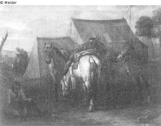 Vor zwei Zelten stehen zwei dunkle Pferde und ein Schimmel, jeweils gesattelt, links vorn eine sitzende männliche Figur, dahinter eine weitere neben dem Zelt hervortretend; Signatur: PVB 1704; Maße: 28,5 x 36,5 cm