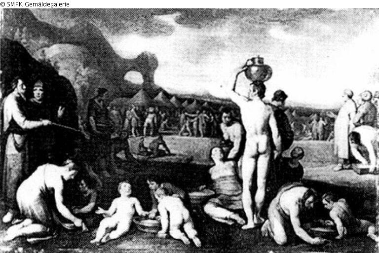 Panel painting: Depiction: the manna is gathered in baskets and pots; gather; basket; pot; signature: at the bottom in the centre: CvH (joined); dimensions: 57 x 80 cm