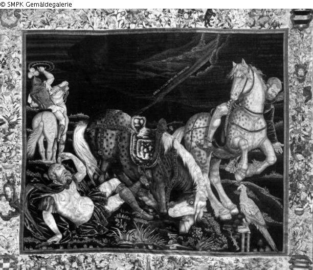 Gobelin, Textilkunst: Wandteppich: auf dem Weg nach Damaskus erscheint Christus dem Saulus, der durch das Licht erblindet und vom Pferd stürzt; Christus; fallen; Pferd; Blindheit; Licht; Reise; nach einer nicht näher zu bestimmenden Arbeit des Hans Baldung-Grien (1484/85 - 1545) / Bez. diagonal oben Mitte: .SAVLE(..LE) QVID.ME. PERSEQVRis.; Signatur: siehe 'Beschreibung'; Maße: 300 x 350 cm