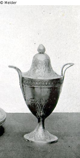 urn-shaped with Empire leaves decoration, tangled belt on trunk, oval framed leafy opening cover, glandiform button on top; Maker’s mark: BC
