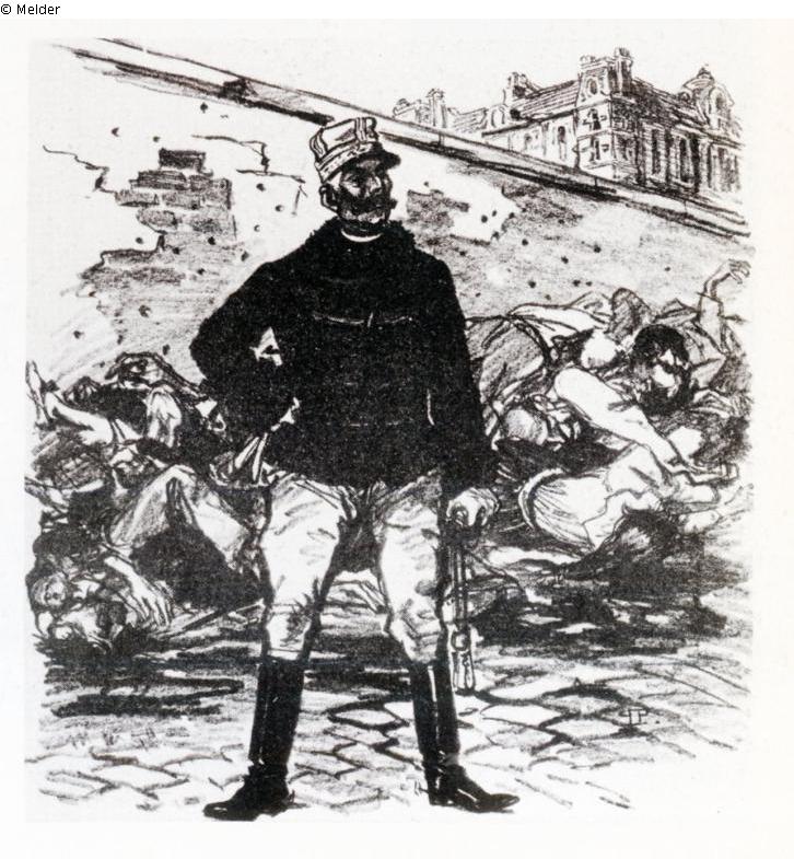 "Breitbeinig, mit Reiterhosen, Uniformjacke und Generalsmütze steht er da, General Gallifet, vor den Leichenbergen, die vor der Mauer gestapelt worden waren. Er hatte die Erschießung der Kommunarden an der Mauer des Friedhofs ‚Père Lachaise‘ befohlen. Fuchs beschreibt in seiner Karikaturengeschichte das Blatt folgendermaßen: Am Gedenktage der Juni-Schlacht präsentiert Steinlen den General Gallifet „Dans toute sa gloire – Frauen, Kinder, Greise, … nichts hat ihm zu widerstehen vermocht“, als er nämlich im Jahre 1871 als Versailler General die Füsilade der gefangenen Kommunarden besorgte." (UW)