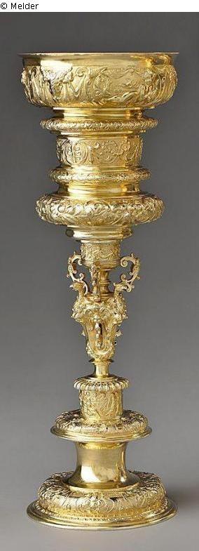 Deckelpokal in klassischer Renaissanceform des Osnabrücker Goldschmiedes Conradt Del(l)brügge, um 1630. Silber vergoldet, Fuß, Kuppa und Deckel mit ziselierten Treibarbeiten gestaltet: Putten bei der Weinlese und Weinzubereitung, als umlaufendes Fries ein Hochzeitsfest und auf der Kuppa Jupiter und Venus. Auf der Unterseite des Fußrandes eingraviert: Conradt Delbrugk.dd.1659. Nach der Inventareintragung des Ratsschatzes von 1673 handelt es sich um das Meisterstück von Conrad Delbrügge dem Jüngeren.