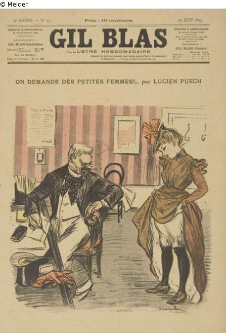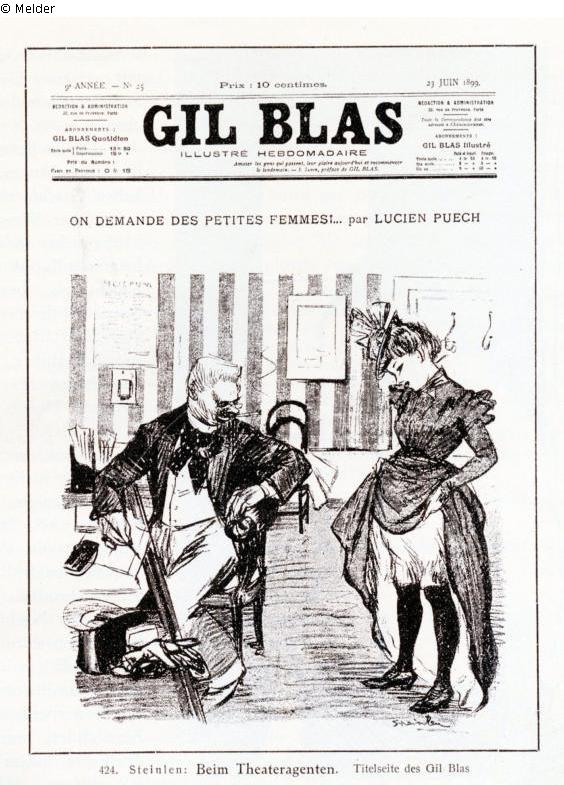 "Besitzt er eines der Café-Concerts auf dem Montmartre ? Jedenfalls nutzt der Mann mit seinem bunten Halstuch, Zylinder, Spazierstock und Glacehandschuhen seine Position, um ein junges Mädchen auf ihre erotischen Reize zu begutachten. Eine „#MeToo Debatte“ vor mehr als hundert Jahren, interessant wie früh Steinlen die Themen Alltagssexismus, Übergriffe, Machtmissbrauch aufgriff. Man verlangt „Junges Fleisch“ sagt der lüsterne Theateragent und lässt Sie den Rock anheben." (UW)