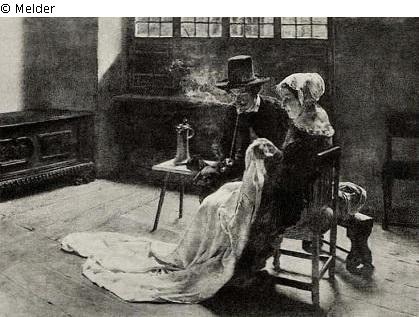 In einem holländischen Zimmer, das scharf von oben beleuchtet wird, sitzt ein junges Mädchen, das wasche näht, neben ihr ein rauchender junger Mann im roten Rock. Signiert und datiert.