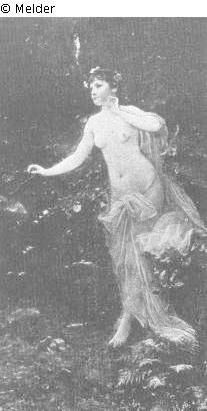 Weibliche Figur mit entblößtem Oberkörper und von einem Tüllschleier umkleideter Hüfte bewegt sich schwebend zwischen kleineren Pflanzen vor einem dunklen Hintergrund mit Bäumen; Blumenschmuck im Haar, den rechten Arm nach vorn erhoben, den linken angewinkelt und die Hand in Höhe des Halses haltend; Signatur: Hermann Koch München; Maße: 227 x 125 cm