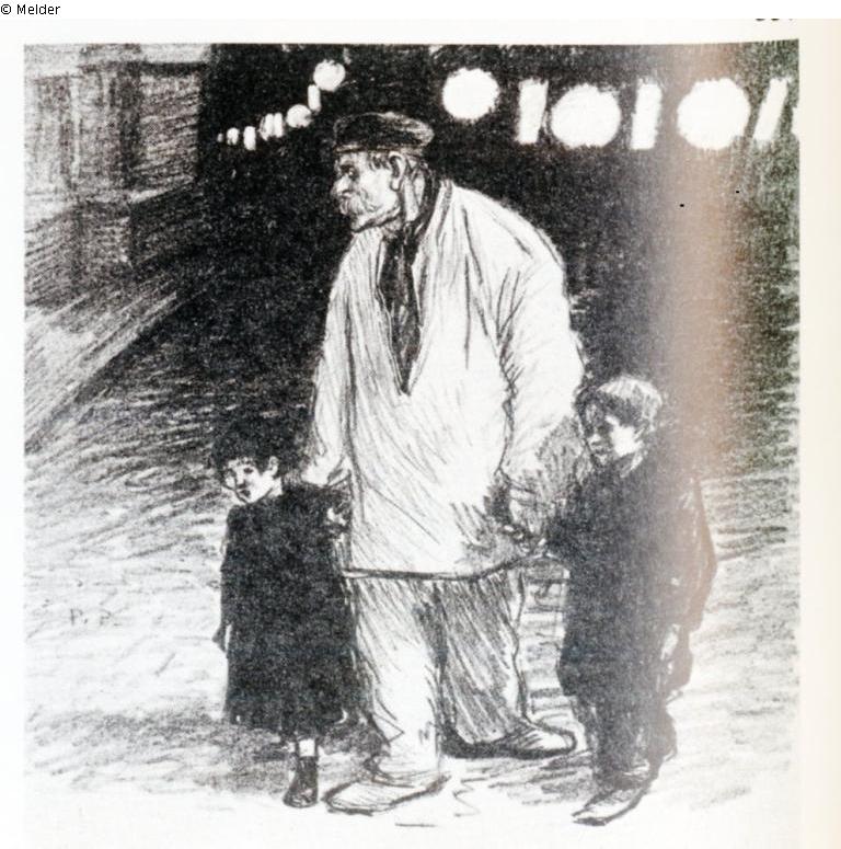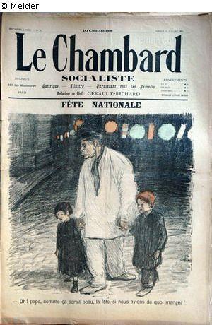 "Zum Nationalfeiertag 1894 erinnert Steinlen daran, dass die in der Revolution erkämpften Werte „Egalité, Fraternité, Liberté (Gleichheit, Brüderlichkeit, Freiheit)“ angesichts des enormen Reichtums aus den Kolonien, der Luxusversprechungen und des Bauwahns durch Kaiser Napoleon III. in Vergessenheit geraten sind. Der Arbeiter, charakterisiert durch den Arbeiterkittel und das Halstuch führt seine Kinder durch die mit Lampions geschmückten Straßen. Entlarvend die Feststellung des kleinen Mädchens: ‚Oh! Papa, wie schön wäre das Fest, wenn wir etwas zu essen hätten." (UW)