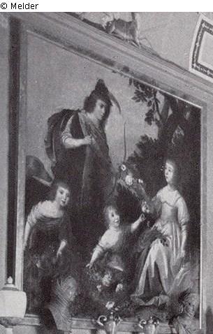 three female figures with flowers and fruits, one male with a hare