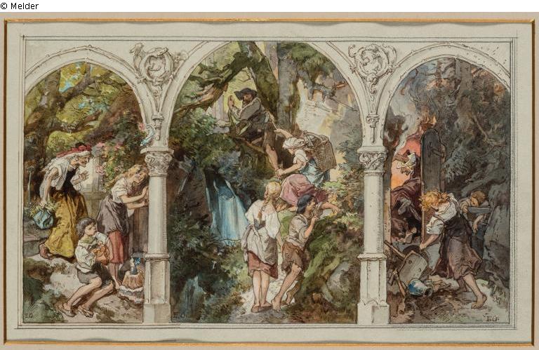 Under three architectural arches the painting shows three scenes from the fairy tale "Hansel and Gretel". Probably on the left: The witch discovers Hansel and Gretel at her house; center: the children are abandoned in the forest; right: the witch is pushed into the oven.