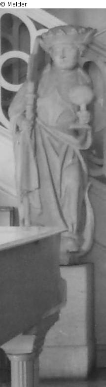 in Ritterrüstung mit einem langen Mantel, der vor dem Leib hochgerafft ist, auf einem besiegten König stehend, mit aufgeschlagenem Hut mit Kronreif, in der Rechten eine Hellebarde (ergänzt), in der Linken ein kugeliges Gefäß, grauer Sandstein