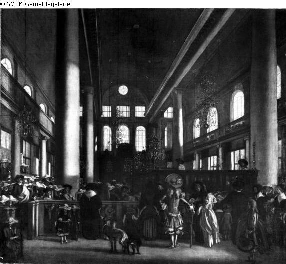 Panel painting: Depiction: the synagogue (as a place of worship and architecture in the Jewish religion) & depiction of the interior of a building; synagogue & interior (situated)