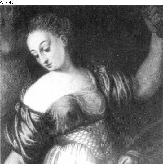 Three quarter length figure of a young blonde woman with a sword in her left hand, wearing a low-necked dress with a metal scaly belt.