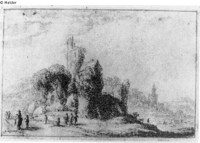 From the left foreground a path runs past a tower-like building, on which one sees a horseman and 8 other men. Signature: lower left: g. neyts f. Pen in brown.