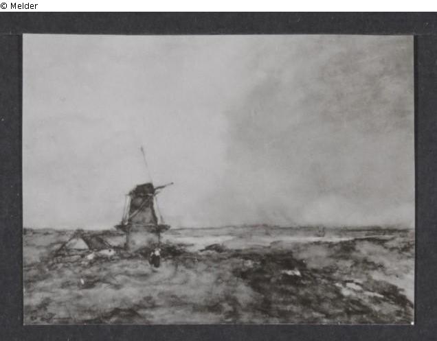 on back Label with Inventory no. and Seal; Landscape with a windmill. A windmill on a high dune above the seashore at the left, a view of the sea at the right