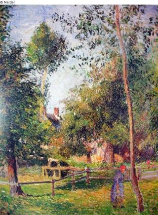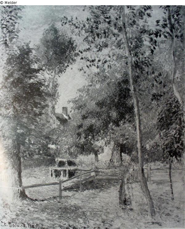 Farm garden in Éragny enclosed with wooden fence. Tall, spring-like golden-green trees in the foreground, through which the sun casts shadows. To the left of the foremost tree stands a peasant woman, dressed in a blue-violet dress and red headdress, holding a bucket in her right hand. In the depth of the picture gable and roof of a house with two chimneys. Signed and dated at lower left: C. Pissarro. 1885.