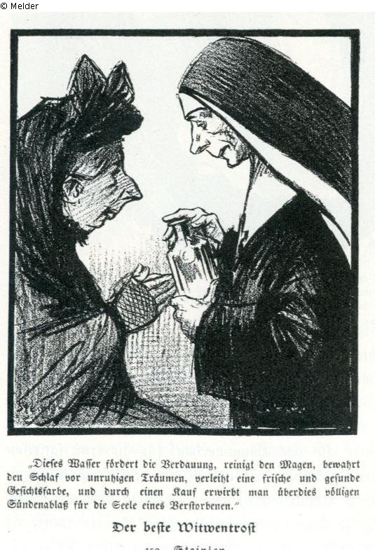 "Eine Nonne als Tempelhändlerin im Kundengespräch mit einer Witwe, der sie ein Wundermittel vergleichbar dem bekannten Klosterfrau Melissengeist anbietet. Eduard Fuchs hat diese Verkaufsstrategie übersetzt: ‚Der beste Witwentrost: Dieses Wasser fördert die Verdauung, reinigt den Magen, bewahrt den Schlaf vor unruhigen Träumen, verleiht eine frische und gesunde Gesichtsfarbe, und durch einen Kauf erwirbt man überdies völligen Sündenablass für die Seele eines Verstorbenen.‘ Steinlen bezieht sich hier auf die im neuen Testament geschilderte Austreibung der Händler aus dem Tempel durch Jesus." (UW)