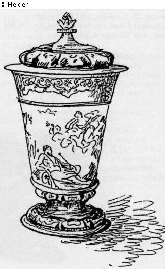 One of four conical lidded beakers; domed lid with knob in the shape of a leaf bud; lid, rim and foot decorated with leaf work and strapwork; mythological scenes as enamel painting around the circumference of the wall.