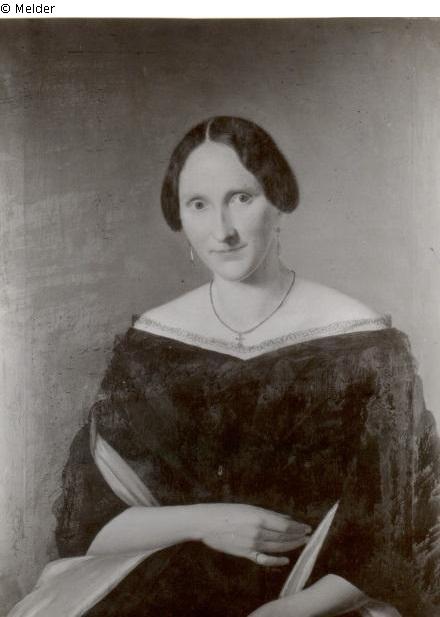 Lorette Greiner (1810-?); Ehefrau von Franz Greiner,ab 1836 in Berlin, Hüftbild, leichtgewelltes, über den Ohren gescheiteltes Haar, das schwarze, m. schmaler Spitze verzierte Kleid lässt die Schultern frei; lange Ohrgehänge und Halskette mit Kreuz-Anhänger; schmaler, weiß-gefütterter Schal, rechte Hand in Gürtelhöhe
