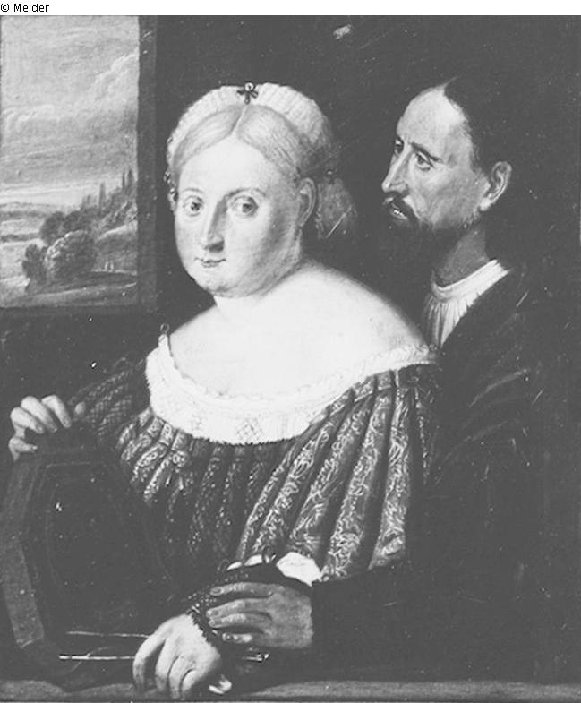 Half figures to the left on a dark background. The bright blond woman holds with her right hand a mirror. The gentleman who is standing behind her, puts his left hand on her arm. On the mirror you can read S.P.R.