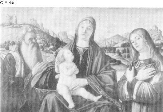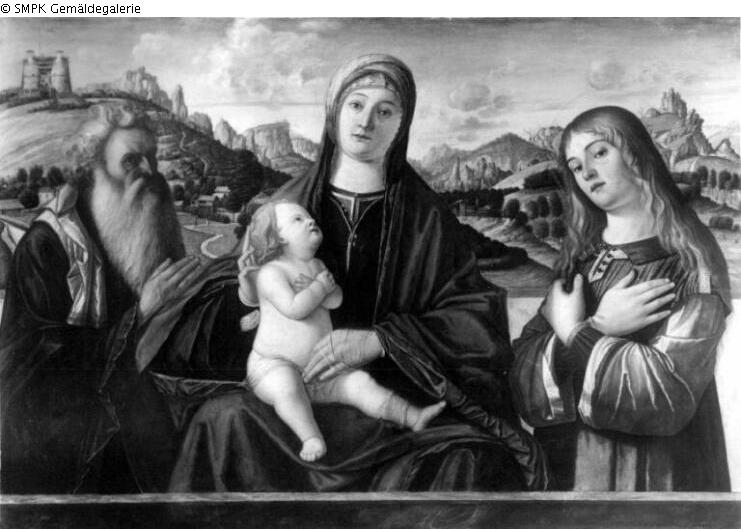 Panel painting: depiction: Mary seated or enthroned, the Christ Child sitting on her knee & Sacra Conversazione; Madonna; Christ Child; knee; sitting; left & Sacra Conversazione; sacred