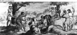 Panel painting: depiction: John the Baptist in the desert; usually accompanied by a lamb & adolescent, adolescent; wilderness; desert; lamb & adolescent