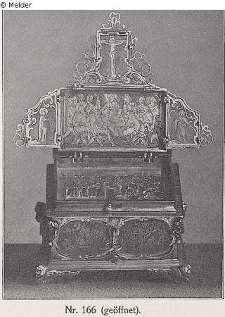 Silver box with all-round engraving, partially gold-plated. The chest rests on four feet in the shape of angel heads and carries on the multi-tiered lid the reclining figure of a boy with hourglass and skull. The narrow sides, and the broad sides divided by two fields, each consist of an oval baroque frame with scenes from the Passion story, delicately engraved, as does the underside of the lid. The lid itself can be opened twice and has an altar-like shrine with openwork, hinged attachments. All areas of the lid are also engraved with scenes of the Passion and with the half-figures of Peter and Paul.