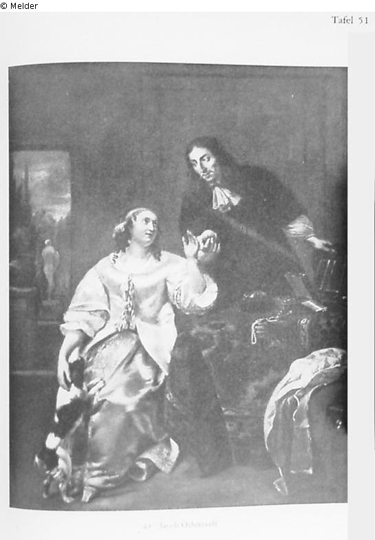 An einem Tisch, der mit einer Decke bedeckt ist und auf dem sich mehrereToilettegegenstände befinden, sitzt eine vornehme Dame in blauem Atlasrock und hellblauem Seidengewand. Mit der rechten Hand streichelt sie einen Hund, der an ihr emporspringt, und sie wendet sich einem hinter ihr stehenden Herrn zu, der ihr einen Apfel reicht. Links durch die Tür Ausblick in einen Park mit einer Statue. Goldener Rahmen. Gutachten: Bode ("...echtes, charakteristisches und trefflich erhaltenes Werk des Jacob Ochtervelt..."). 8.11.1926