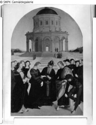 Panel painting: depiction: the wedding of Mary and Joseph (sposalizio): they are married by the high priest; wedding; sposalizio; priest; high priest