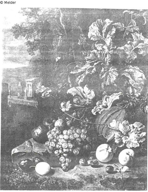 Gemälde: Vor einer Felsenwand liegen auf einer Steinplatte ein aufgeschnittener Kürbis. Weintrauben, eine Citrone, Birnen und Pflaumen. Darüber Blattranken. In der Ferne links eine abendliche Parklandschaft mit Statuen. Rechts im Laub eine große Statue.