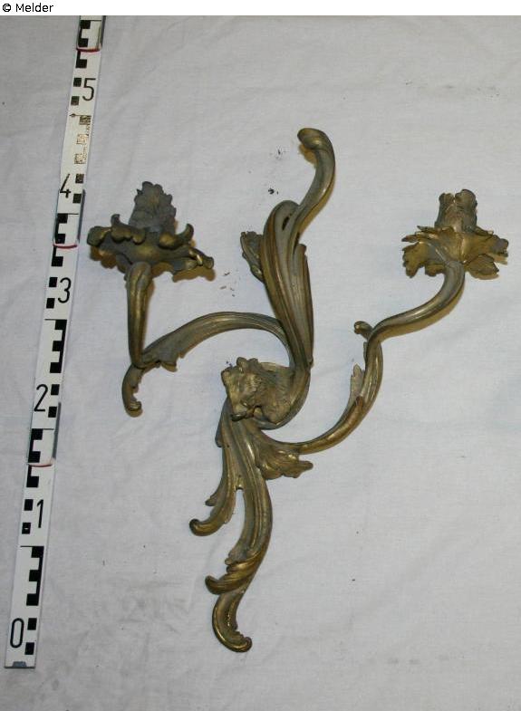 3 light fittings, probably electrified in 1897. The animal heads on the sconces are roebuck heads on the one hand and boar heads on the other, which corresponded with the hunting motifs on the chests of drawers and corner cupboards in the room.