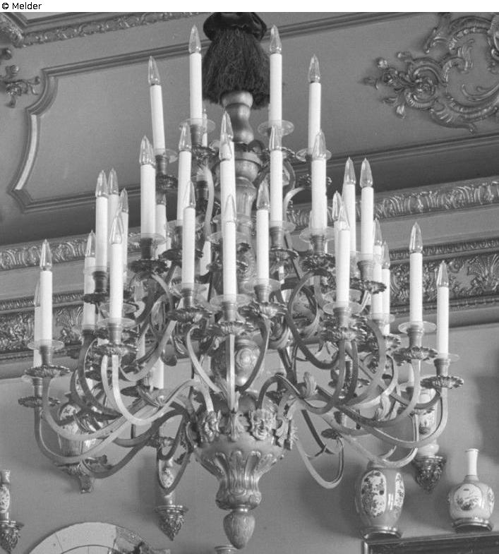 Dresden Castle, state rooms; listed in inventory no. 1 dated January 31, 1920, as part of the settlement agreement between the Free State of Saxony and the former royal house of 1924, as room inventory marked with a red cross, belongs to the state; The two chandeliers from the first and second antechambers (coffee room) were either already moved on April 13, 1944, or at the latest with the second transport on April 21, 1944, to the relocation site at the Brauna manor near Kamenz. The chandeliers from the corner hall arrived at Zottewitz Castle on April 27, 1944. They were stored in the basement of the main building, while the large central chandelier was placed in the garage of the farm building. Nothing is known about the circumstances surrounding the loss of these objects. It is assumed that they were lost in connection with the events of World War II.