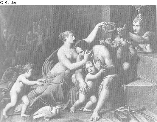 Venus und Mars vor einer Treppe sitzend mit mehreren Amoretten; Venus mit der rechten Hand das Gesicht von Vulkan umspielend reicht mit der linken und hinter dem Rücken von Vulkan dem hinter der Treppe auftauchenden Mars einen Lorbeerkranz; links im Hintergrund die Schmiede des Vulkan; Signatur: R. Suhrlandt pi 1810; Maße: 97 x 73 cm