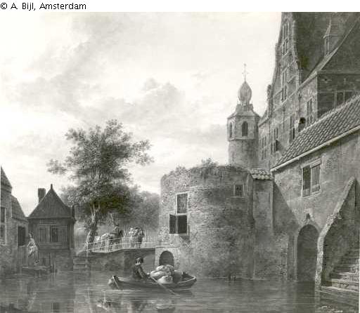 Scene with an immovable bridge over a city canal surrounding the castle. Castle has a large, square tower. A vehicle appears on the bridge and a small boat on the canal.