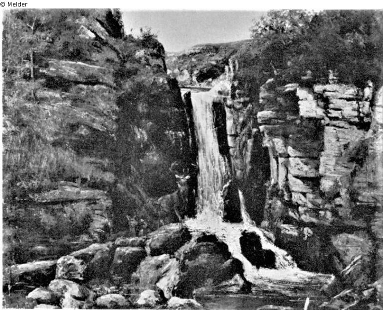 Parke-Bernet: A glimpse of a lake surrounded by steep green shores beneath a blue sky, seen from the foot of a waterfall, the gorge in the foreground enclosed by vertical rocks surmounted by trees; near the observer at centre appear a stag and two doe listening at the water's edge. Signed at lower left G. COURBET. (Hanak) [Marginal:] 800