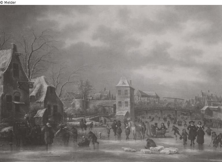 A multitude of people are enjoying themselves on the ice. You can see skaters, sledges harnessed to horses or pushed by children, groups of people chatting, etc. The canal is lined with snow-covered houses. On the far left is the inn "het Zwaantje". A drawbridge can be seen in the background. Thick, grey-brown clouds cover almost the entire blue sky.