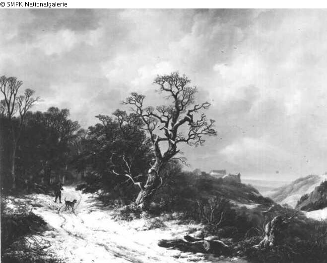 Panel painting: Depiction: Winter landscape; landscape denoting winter (in the division of the year into four seasons) & deciduous forest & trees: oak tree & ravine, crevice, abyss, canyon & farm or secluded house in a landscape & dog.