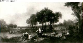 Panel painting: depiction: riverbank & occupations related to livestock breeding, husbandry; river & breeding; industry