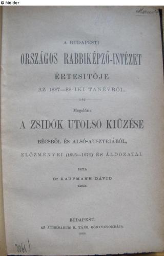 restituted Found-Object Report A zsidók utolsó kiüzése Bécsből és Alsó-Ausztriából, előzményei (1625 - 1670) és áldozatai A Budapesti Országos Rabbiképző-intézet Értesitője 1887/88 Author David Kaufmann Publisher Athenaeum Object type Book Lost Art-ID623552