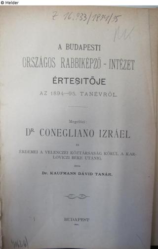 restituted Found-Object Report Dr Conegliano Izráel és érdemei a velenczei köztársaság körül a karloviczi béke utánig A Budapesti Országos Rabbiképző-intézet Értesitője 1894/95 Author David Kaufmann Publisher Athenaeum Object type Book Lost Art-ID623555
