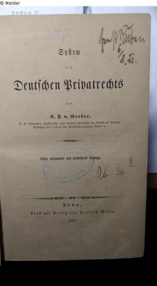 Found-Object Report System des Deutschen Privatrechts Author C. F. v. Gerber Publisher Mauke Object type Book Lost Art-ID606635