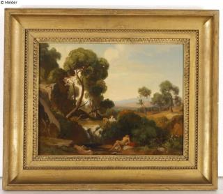 Found-Object Report Ideal landscape with Pyramus and Thisbe Artist / Creator Schirmer, Johann Wilhelm Object type Painting Material / TechniqueOil ; Cardboard ; Panel / painted ; mountedLost Art-ID626687