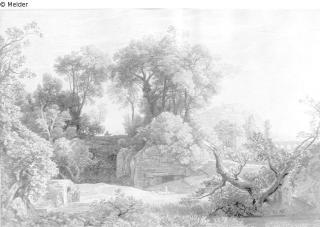 Found-Object Report Forest landscape with a bow bridge (ideal landscape with staffage) Artist / Creator Schirmer, Johann Wilhelm Object type Drawing Material / TechniqueCharcoal / drawnLost Art-ID565988
