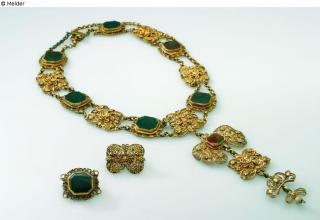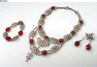 restituted Found-Object Report Three-piece jewellery set Artist / Creator Unknown (Schwäbisch-Gmünd) Object type Jewelry Material / TechniqueMetal (Silver) ; Heliotrope / Filigree ; gildedLost Art-ID580785