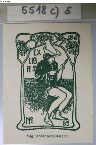 Found-Object Report Bookplate Vág Sándor Artist / Creator J M / Jasztróczy Mano Object type Exlibris Material / TechniquePrinting ink dark green ; Paper / printed (wood engraving)Lost Art-ID596602